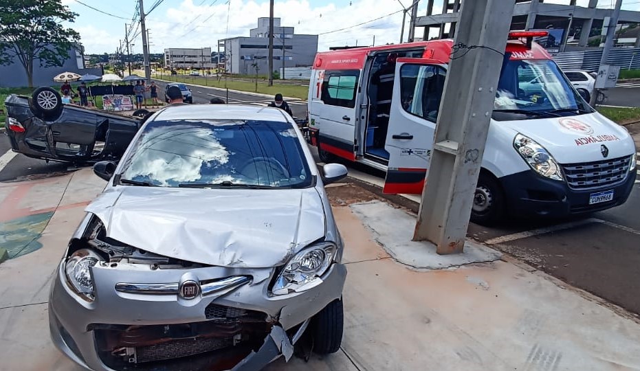 Um carro com um casal de idosos tombou depois de se envolver em uma batida com outro veículo, no cruzamento da Avenida Nildo Ribeiro da Rocha Neto com a Rua Das Azaléias, no Jardim Iguaçu, em Maringá. O acidente foi no início da tarde desta terça-feira, 27. Duas equipes do Samu socorreram o casal.