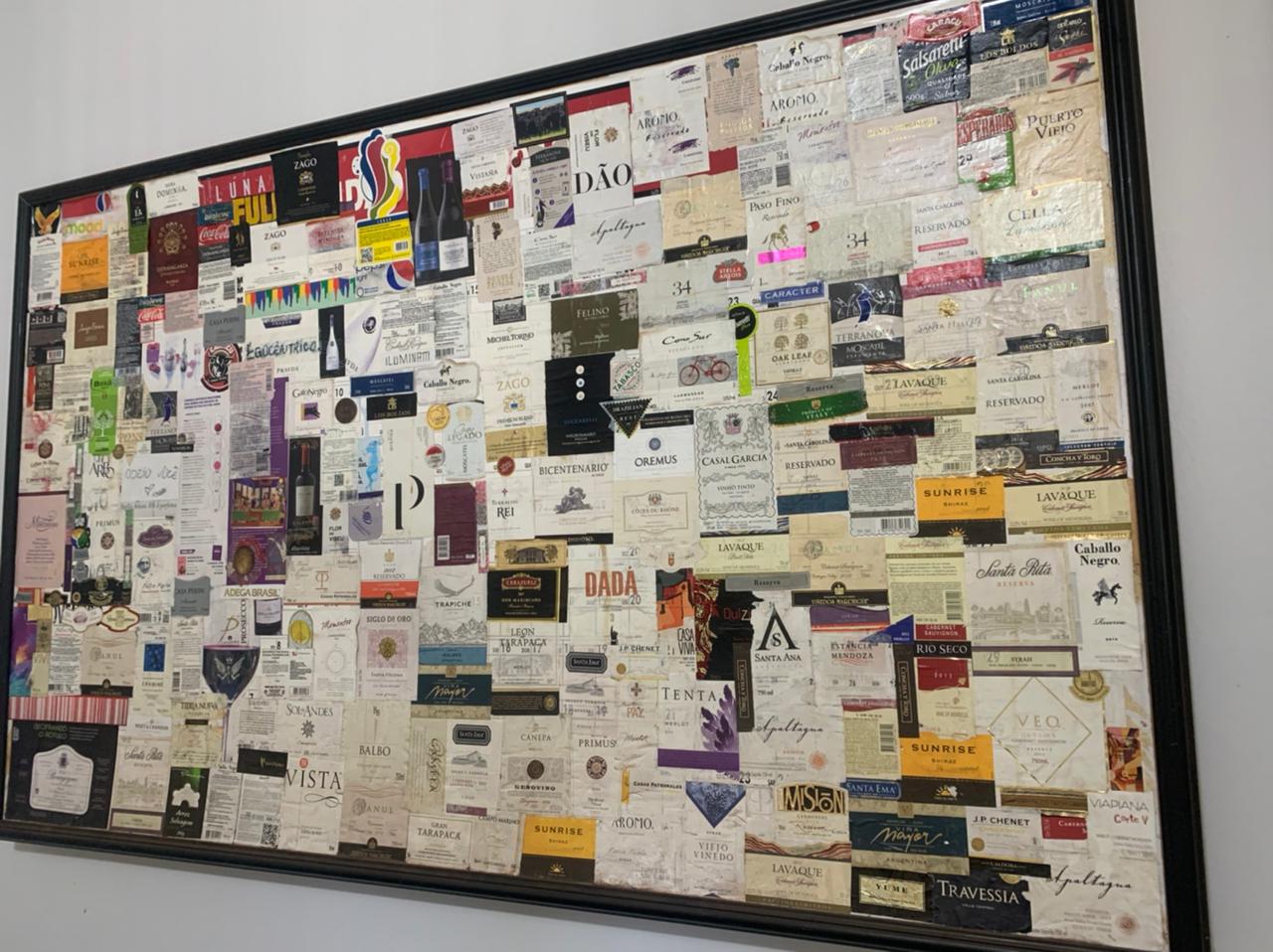 Além de garrafas, o empresário também junta muitos rótulos e rolhas. Esse material vira arte nas mãos de Mauro Sérgio. Pela casa, são vários quadros feitos com rolhas, rótulos e até caixas de vinho. “Eu gosto de ficar inventando as coisas aqui com rolhas, rótulos e garrafas. Fico fazendo essas coisas aí. As pessoas gostam. Sou apaixonado por vinho e como bebo muito acumula mesmo”, acrescentou.
