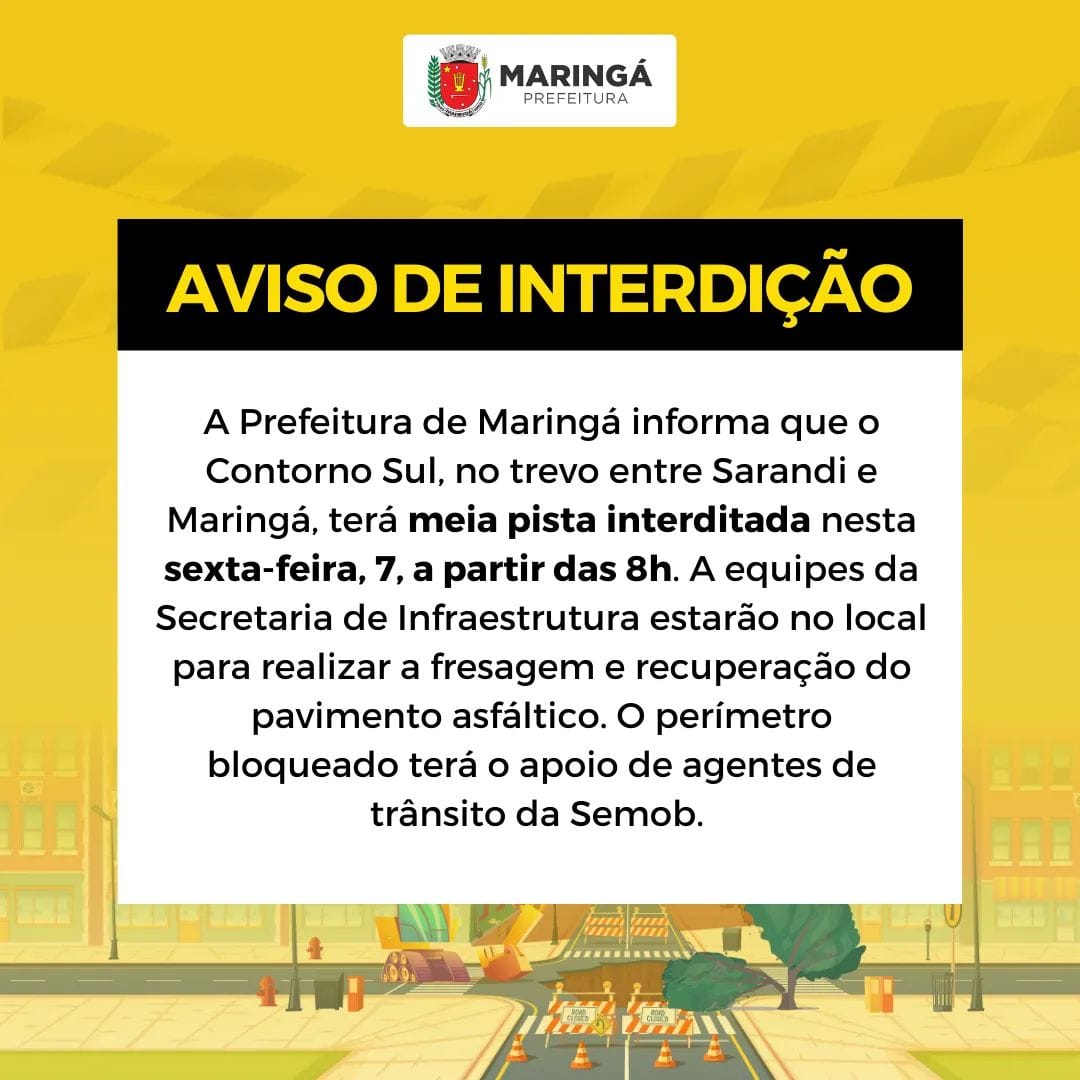 Um trecho do Contorno Sul, entre Maringá e Sarandi, será interditado em meia pista na manhã desta sexta-feira, 7, para reparos na pista, segundo a prefeitura de Maringá.