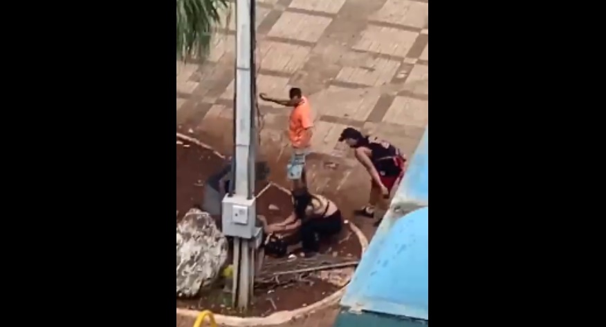 Imagens que circulam nas redes sociais mostram um homem sendo agredido por outros dois rapazes e em seguida atropelado, em plena luz do dia, na Praça Raposo Tavares, região central de Maringá.