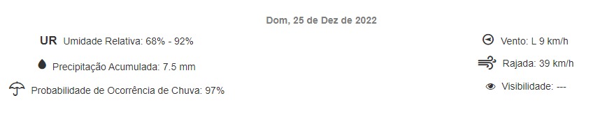 “Muitas nuvens sobre o Paraná neste domingo de Natal. Já há registro de chuvas isoladas entre as áreas mais ao norte e oeste do Estado, mas, por enquanto, com fraca intensidade. A sensação de tempo abafado predomina nas demais regiões paranaenses e, aos poucos, a cobertura de nuvens aumenta nas próximas horas.”