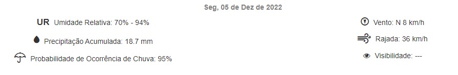 Para hoje, a mínima é de 21ºC, enquanto a máxima fica nos 27ºC, segundo o que prevê o Simepar (Sistema de Tecnologia e Monitoramento Ambiental do Paraná).