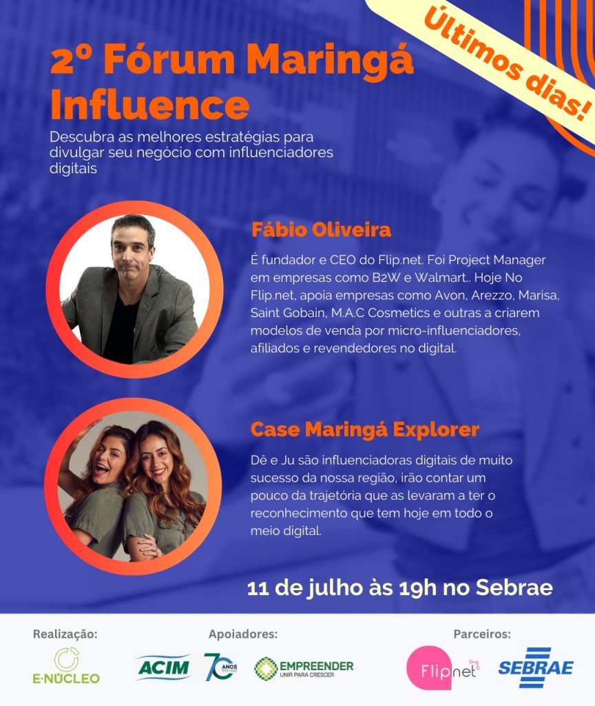 Os influencers estão cada vez mais presentes na vida das pessoas. Hoje, muitos que realizam compras pela internet buscam saber a opinião de algum influenciador para ter a certeza de que o produto valerá a pena. Para entender um pouco mais sobre essa nova profissão que está crescendo no mercado, na terça-feira, dia 11 de julho, vai ocorrer no Sebrae Maringá o 2º Fórum Maringá Influence.