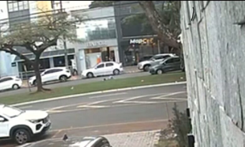 Um vídeo gravado por câmera de segurança mostra o momento em que um idoso de 85 anos é atropelado por um veículo, nesta quinta-feira, 27, na Avenida Independência, em Maringá.