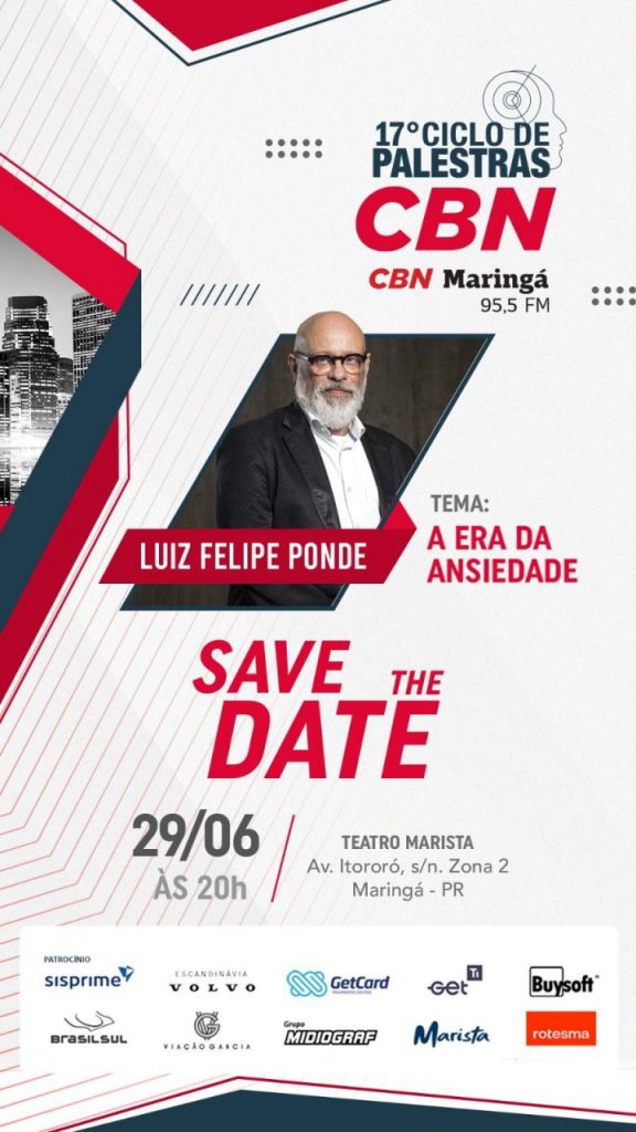 O doutor em Filosofia Luiz Felipe Pondé estará em Maringá para apresentar a palestra ‘A era da Ansiedade’. O evento faz parte do Ciclo de Palestras da CBN Maringá.