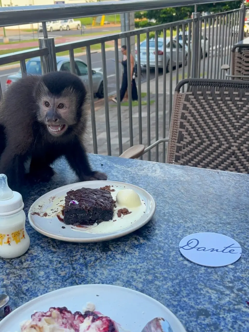 O macaquinho (prego) é o Dante, que recentemente completou dois anos de idade. Em entrevista ao Portal GMC Online, a pet sitter Isabela Cristina, responsável pelos cuidados do animal, explicou que a ida ao restaurante fez parte de uma programação especial preparada para o aniversário dele.