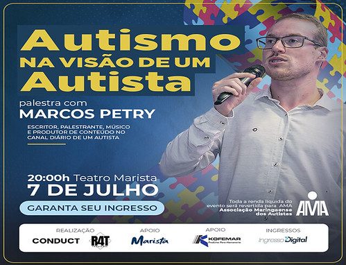 Pensando na importância de conscientização sobre o Autismo, no dia 7 de julho, o palestrante reconhecido nacionalmente Marcos Petry, vai realizar uma palestra em Maringá falando sobre a sua condição autista e sobre a importância do diagnóstico e estimulação precoce. O evento será no Teatro Marista às 20h.