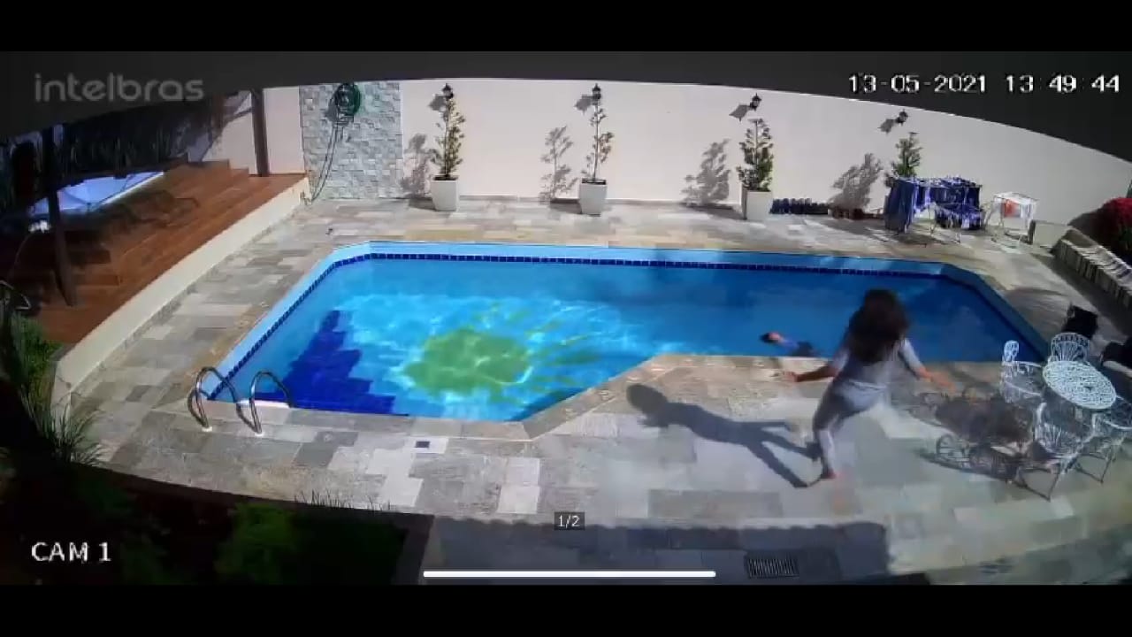 Uma câmera de segurança registrou o momento em que o menino caiu na água. Imagens mostram que a criança estava brincando sozinha com uma caixa próximo à piscina, quando se desequilibrou.