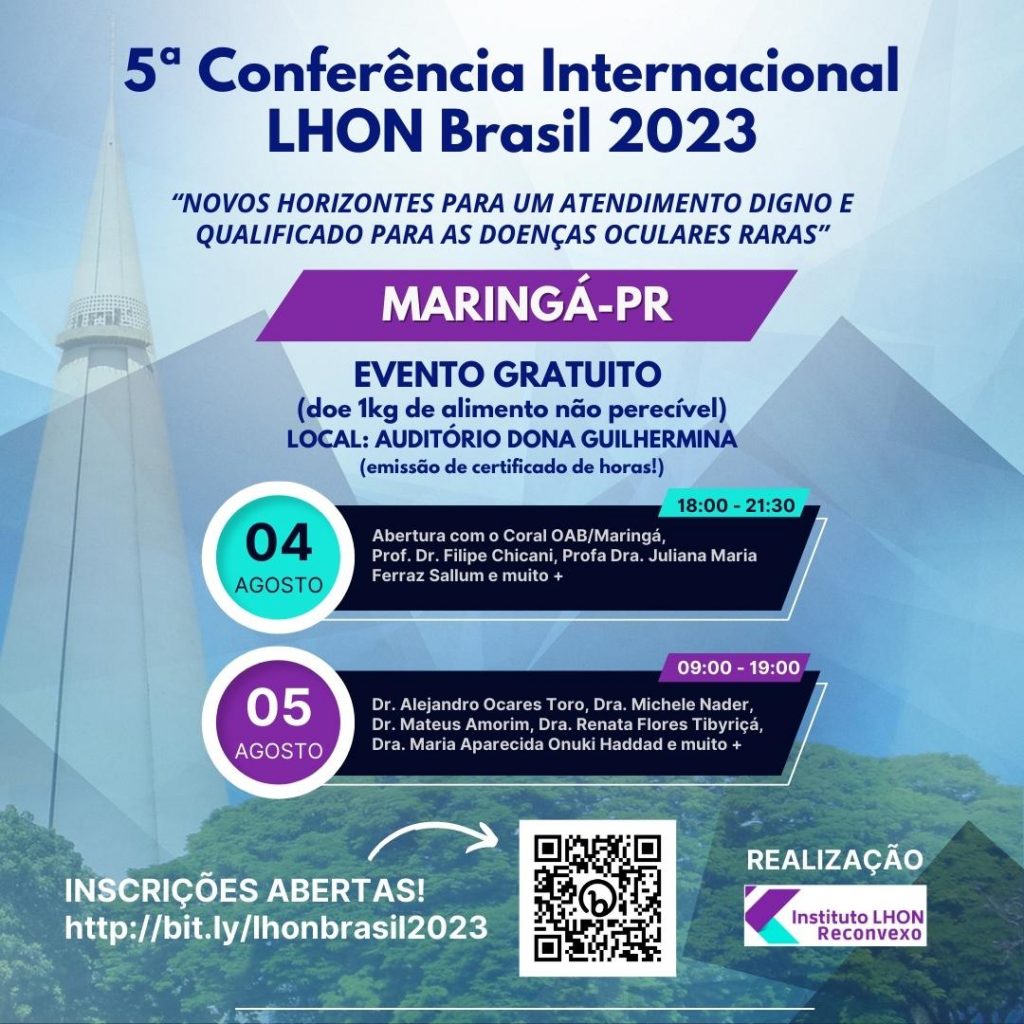 A 5ª Conferência Internacional LHON Brasil será realizada em Maringá entre os dias 4 e 5 de agosto. O evento acontece no Auditório Dona Guilhermina, na Avenida Tiradentes.
