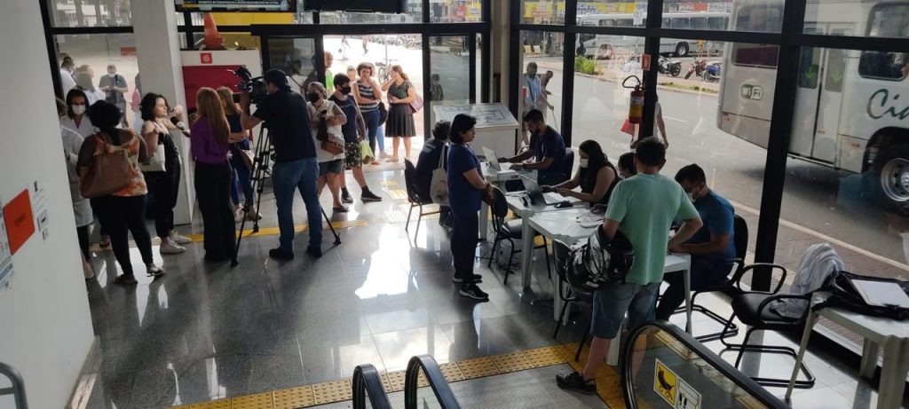 As filas para a vacinação começaram assim que as primeiras doses foram aplicadas. A Alessandra do Vale, que trabalha como empregada doméstica, foi a uma Unidade Básica de Saúde e lá informaram que haveria o mutirão no terminal.