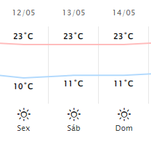 No sábado, 13, e domingo, 14, as mínimas devem ficar em 11ºC e as máximas não passarão dos 23ºC.