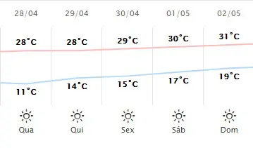 A partir de quinta-feira, 29, as temperaturas começam a aumentar em Maringá, com mínima de 14ºC e máxima de 28ºC. Na sexta-feira, 30, os termômetros variam entre 15ºC e 29ºC, e no sábado, 1º, entre 17ºC e 30ºC.