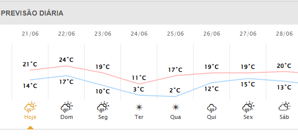 Apesar do sol retornar ao longo da semana, os termômetros devem continuar marcando temperaturas bastante baixas, principalmente nas madrugadas. Já na última semana de junho, o frio volta a se intensificar, com mínimas previstas na casa dos 4°C, segundo o Simepar.