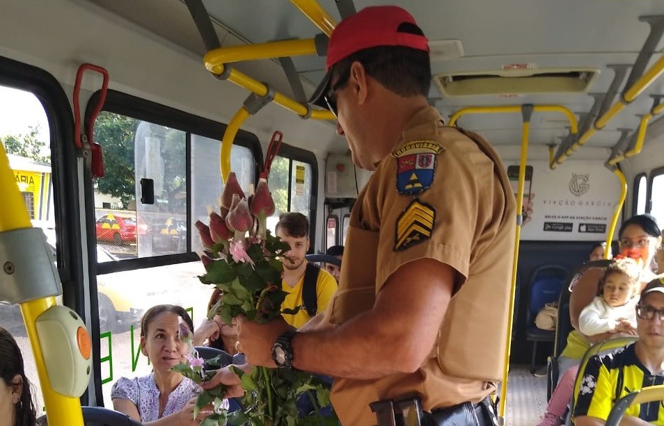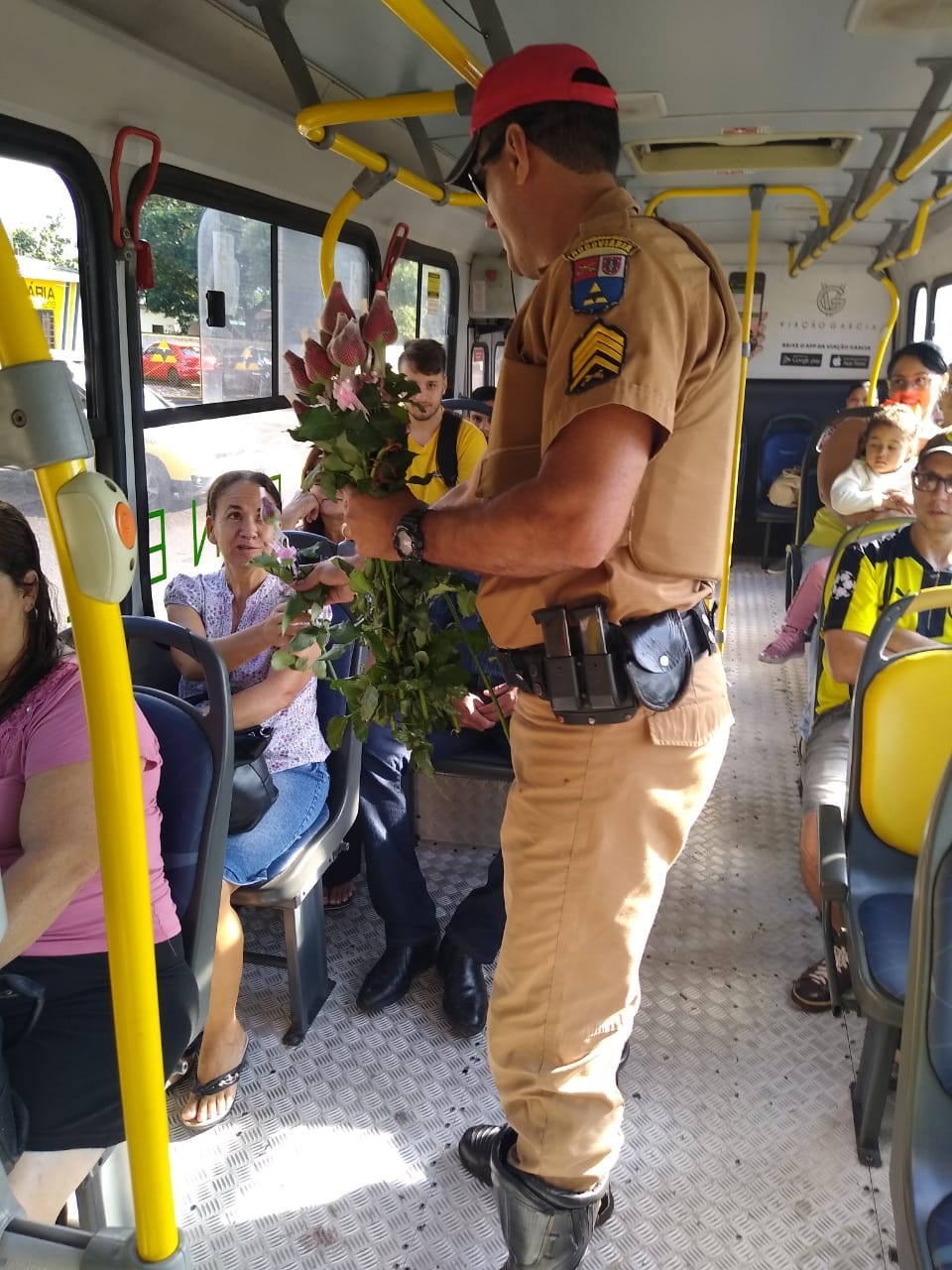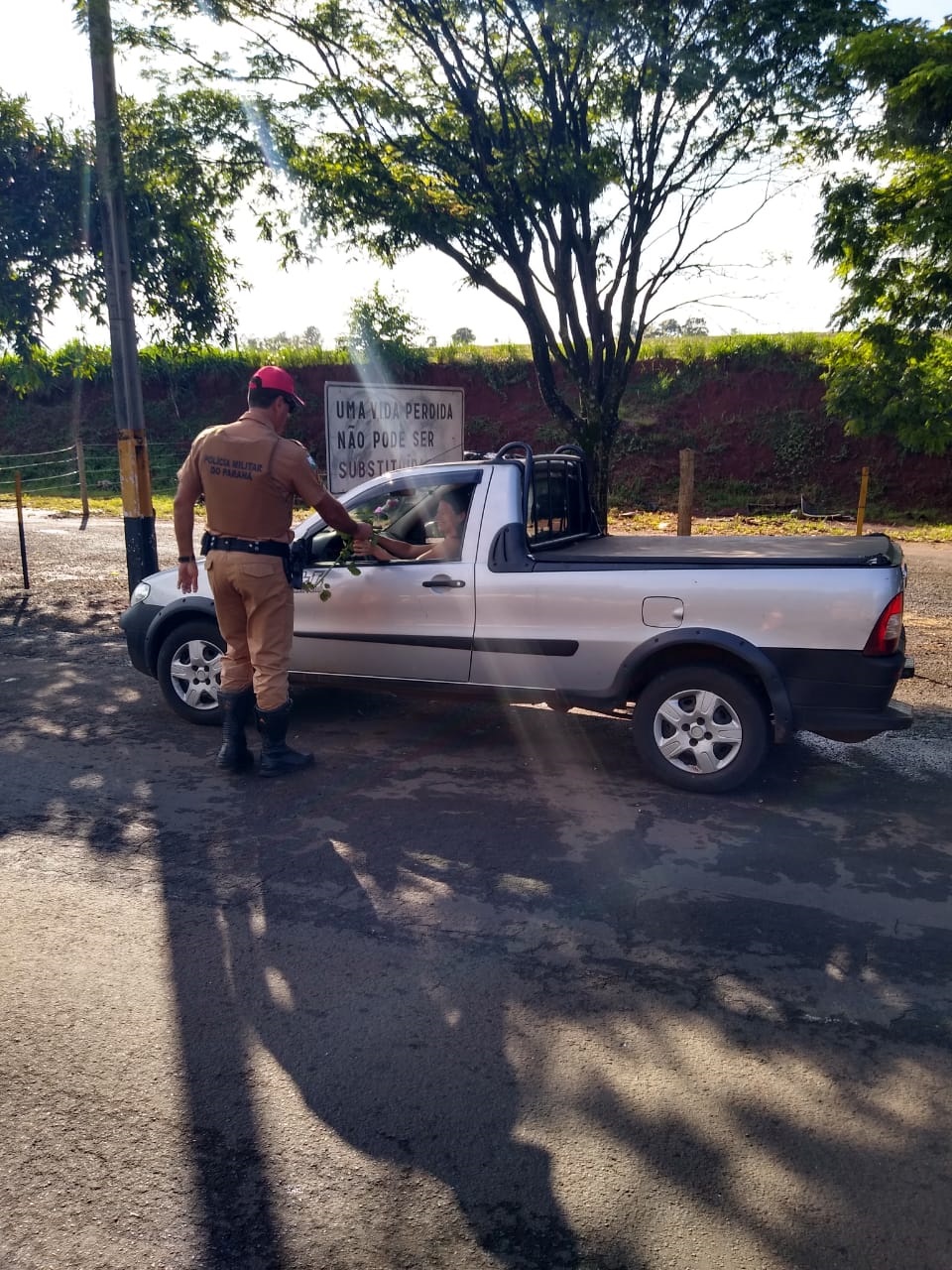A ação acontece em várias rodovias da região neste domingo, 8. Na PR-317, no trecho entre Iguaraçu e Maringá, os policiais entraram nos ônibus, abordaram carros, motos e demonstraram esse gesto de respeito e amor pelas as mulheres neste dia