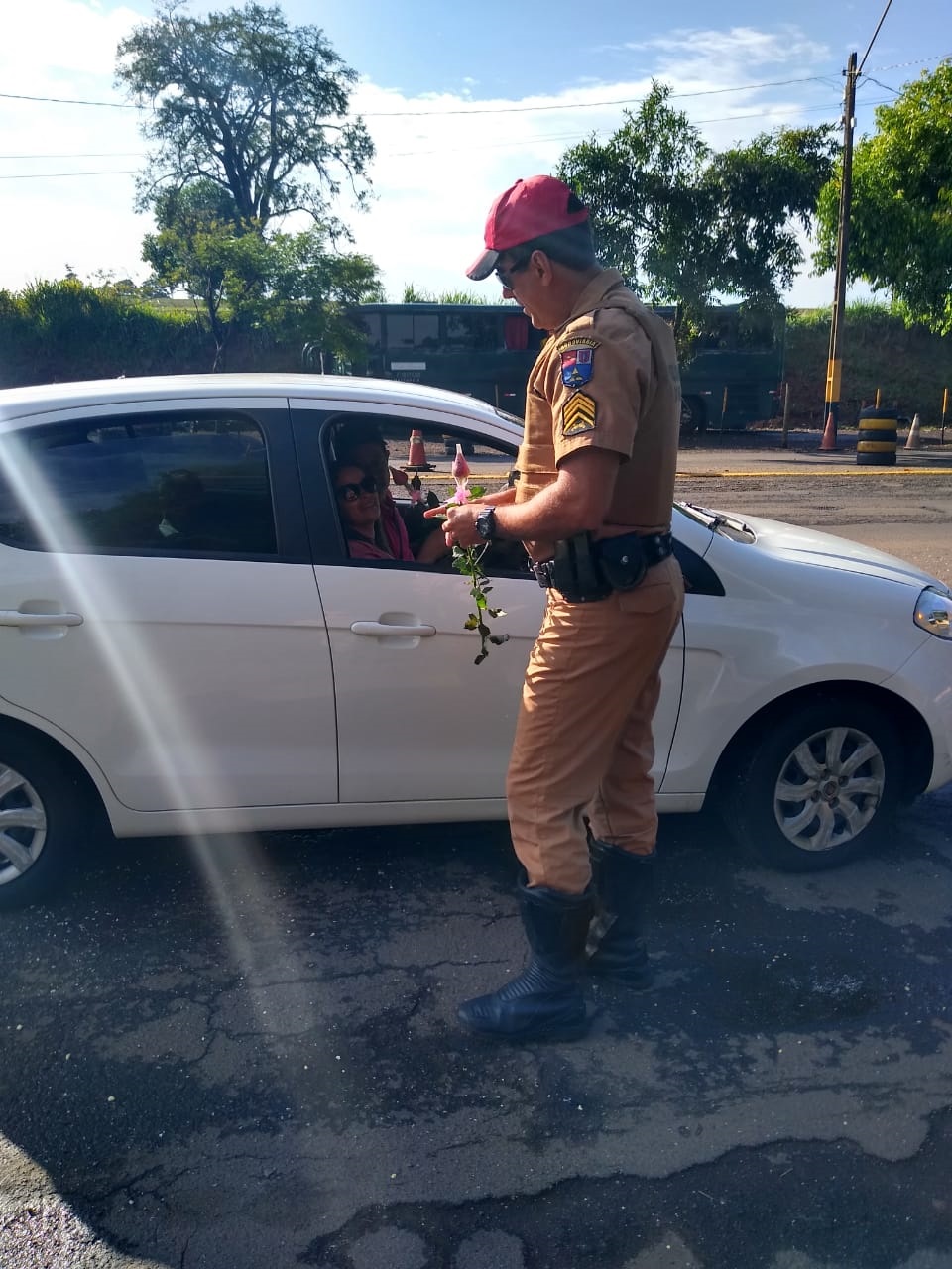 Os policiais entregam a rosa e dão os parabéns em nome da corporação para as mulheres. A ação deve acontecer ao longo de todo o dia em algumas rodovias da região.