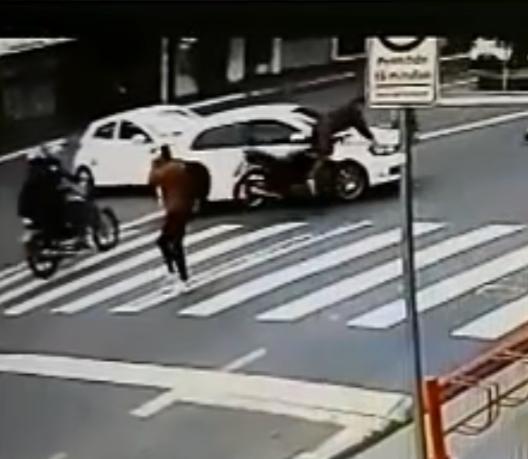 O acidente aconteceu na Avenida Paraná, na esquina com a Rua Rui Barbosa. Uma câmera de segurança flagrou a batida. Na imagem é possível ver que um pedestre quase se envolveu no acidente. Veja o vídeo abaixo: