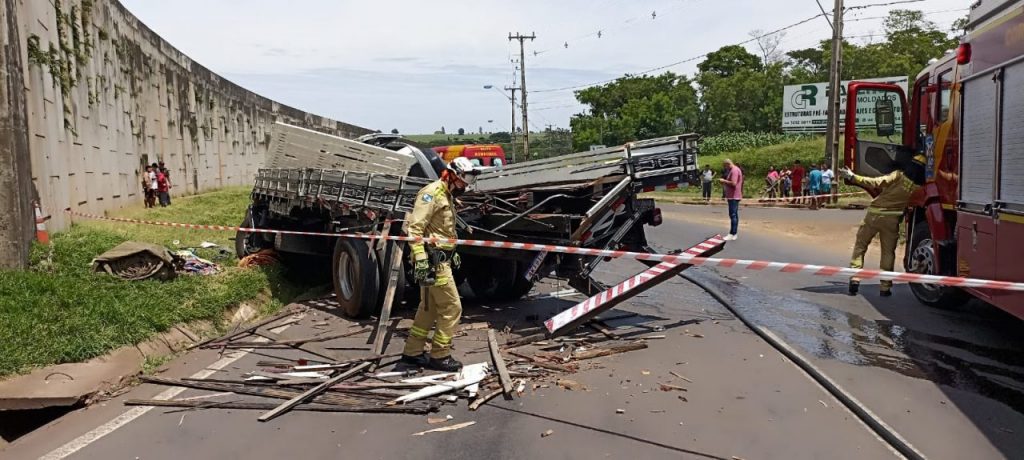 Com a queda do veículo, um trecho da pista acabou ficando interditada. Segundo o tenente Zanelato, do Corpo de Bombeiros, há risco de queda de blocos de cimento do viaduto.