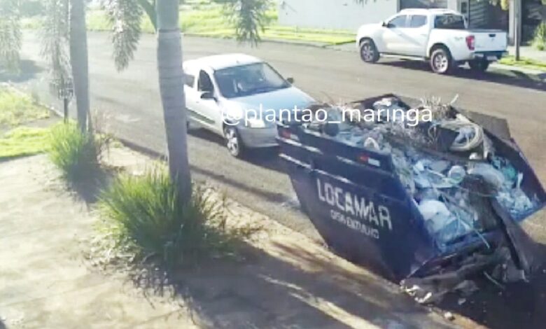 Mulher perde o controle do carro e bate em container de entulho em Maringá