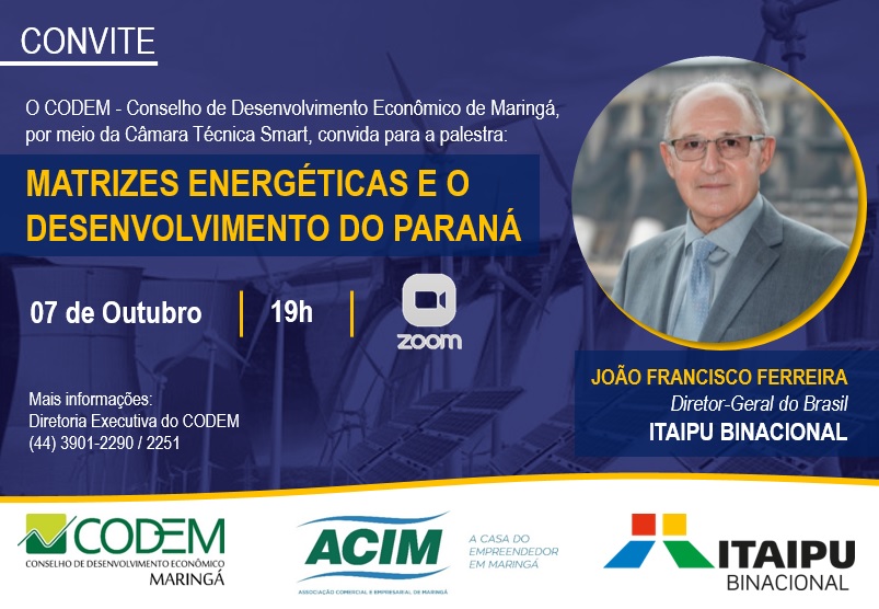 O Conselho de Desenvolvimento Econômico de Maringá (Codem), por meio da câmara técnica Smart, e a Associação Comercial e Empresarial de Maringá promovem nesta quinta-feira, 7, uma palestra sobre matrizes energéticas e o desenvolvimento do Paraná. A reunião será online, a partir das 19h.