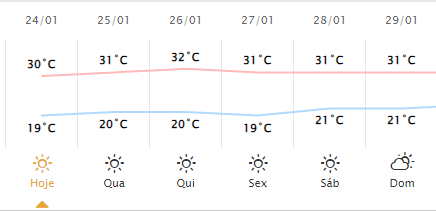 Para hoje, a mínima é de 19ºC, enquanto a máxima chega aos 30ºC, segundo o que prevê o Simepar (Sistema de Tecnologia e Monitoramento Ambiental do Paraná).