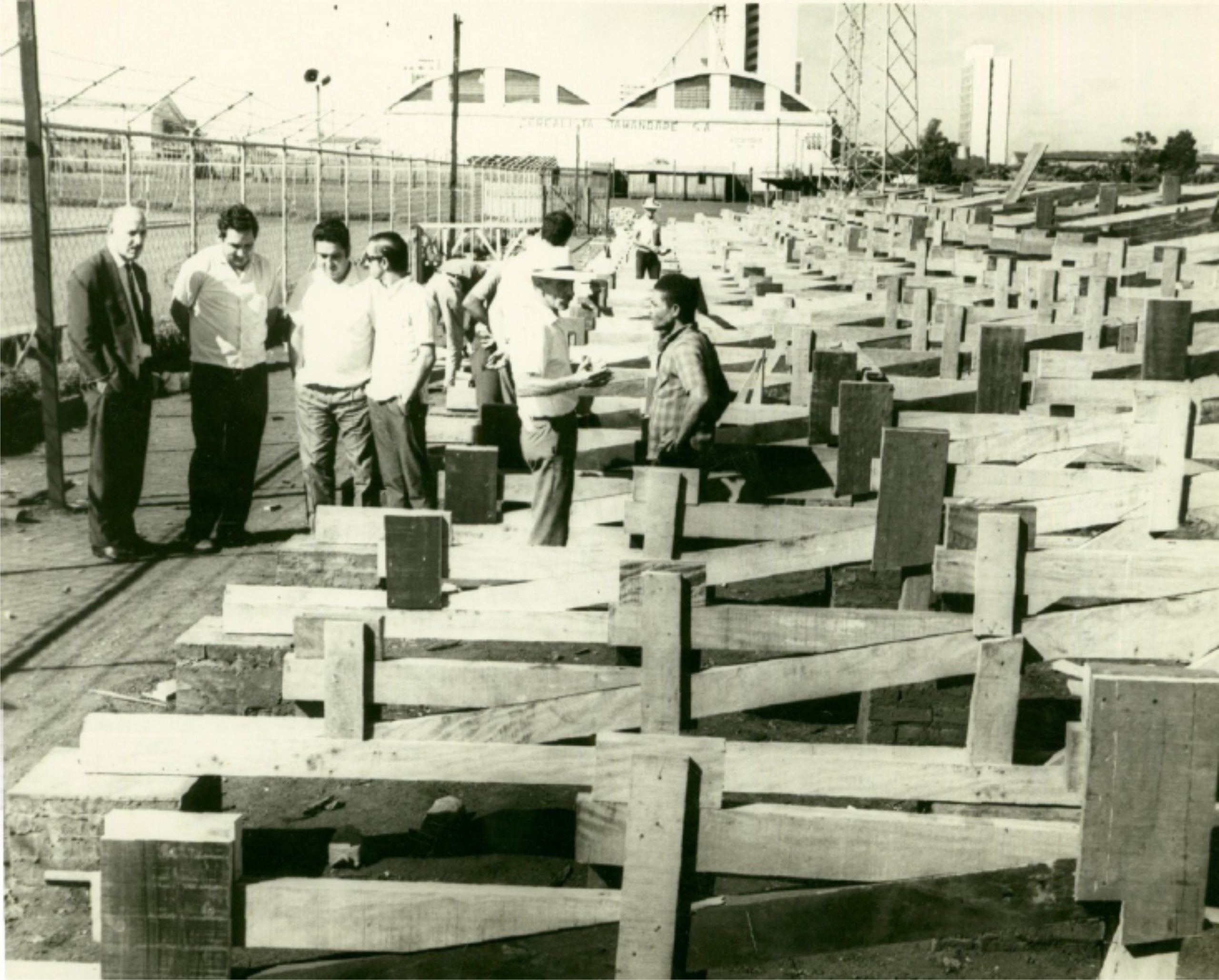 O registro de 1971 mostra a equipe da prefeitura vistoriando as obras de reconstrução das arquibancadas do Estádio Regional Willie Davids.