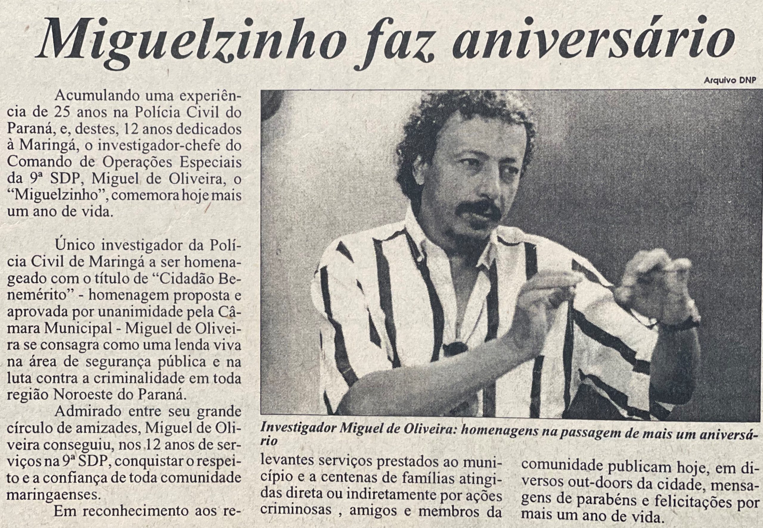 Ele não escondia que mantinha em seu carro uma metralhadora e a usava sempre que preciso. O medo dos malfeitores era pelo fato, segundo contam seus colegas de corporação, de que ele não poupava balas para eliminar aqueles que infringiam a lei. Nascido em Catuni (MG), e em Maringá desde 1983, “Miguelzinho”, como ficou conhecido, era um policial civil temido por bandidos de todo tipo. Ele atuou na corporação por 29 anos, até que foi eleito como vereador de Maringá pelo PDT, em 1996, com 1.484 votos. Três anos depois migraria para o PMDB.
