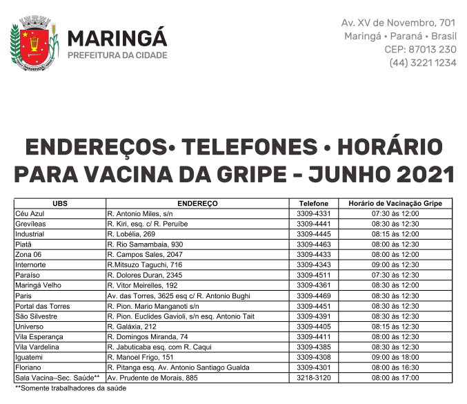 Até a semana passada, 159 mil pessoas tinham sido vacinadas contra a gripe em Maringá. É preciso um intervalo de 14 dias entre as vacinas da gripe e a do coronavírus. Confira os locais de vacinação: