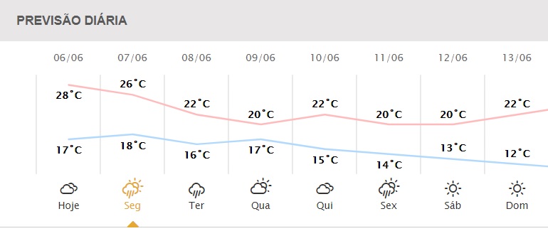 Já na segunda-feira, 7, o dia começa com previsão de chuva. Segundo os meteorologistas o céu ficará parcialmente nublado e com pancadas de chuva nesta segunda, 6. A temperatura oscila entre 18˚C e 26˚C. Na terça-feira, 8, a mesma previsão, no entanto, as temperaturas caem um pouco mais e os termômetros oscilam entre 16˚C e 22˚C.