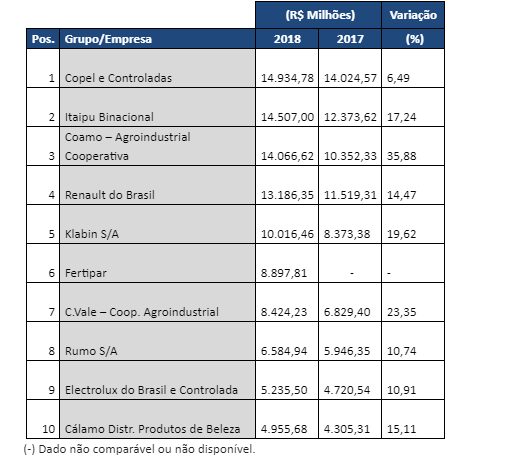 As empresas de Maringá que foram classificadas na edição de 2019 são: Cocamar (35ª), Santa Terezinha (66ª), Unimed Maringá (184ª), Viapar (186ª), Sancor Seguros (276ª), Rivesa (329ª), CPA Trading (431ª), Santa Rita Saúde (481ª), Cinesystem (500ª).