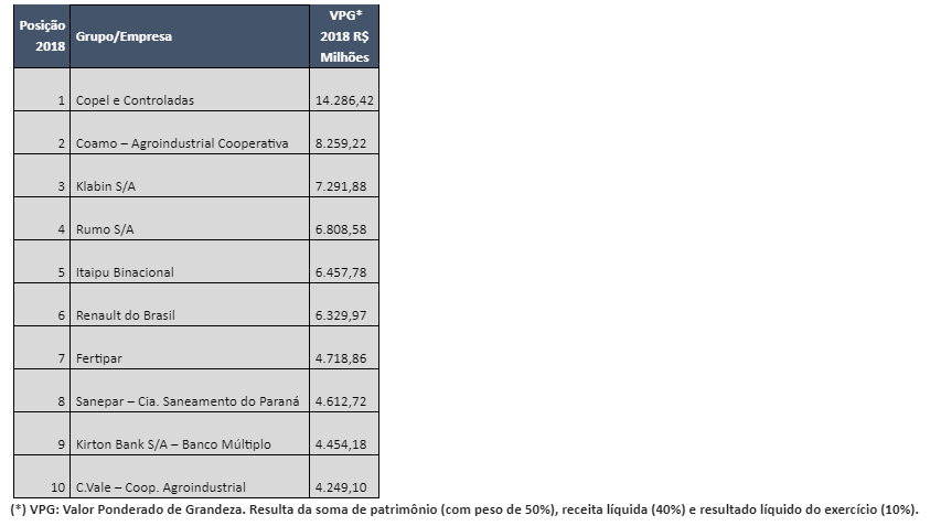 O ranking mostra que as 186 companhias paranaenses listadas obtiveram melhores resultados em vendas, lucro e patrimônio, que são os três componentes do Valor Ponderado de Grandeza, principal indicador da pesquisa.
