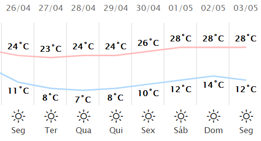A previsão do Simepar (Sistema de Tecnologia e Monitoramento Ambiental do Paraná) para Maringá na próxima semana chega a assustar. Termômetros marcando mínima de 7 graus na quarta-feira, dia 28 de abril, com máxima prevista de 24°C. Essa é a previsão indicada nesta segunda-feira, 19, às 15h30. Segundo o Simepar, seria uma semana nessa faixa de temperaturas.