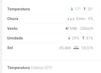 O instituto Climatempo aponta que para hoje a previsão também é de um dia ensolarado, sem nuvens no céu. À noite, o tempo será aberto. A mínima será de 17ºC.