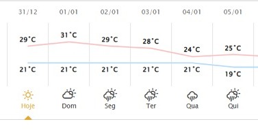 Já no domingo, 1ª, o novo ano começa com tempo bem abafado em todos os setores, situação que favorece o desenvolvimento de áreas de instabilidade, principalmente a partir da tarde. Chuvas previstas são bem pontuais e não perduram por um longo período. O tempo seguirá nublado. A mínima é de 21ºC, e a máxima chega aos 31ºC.