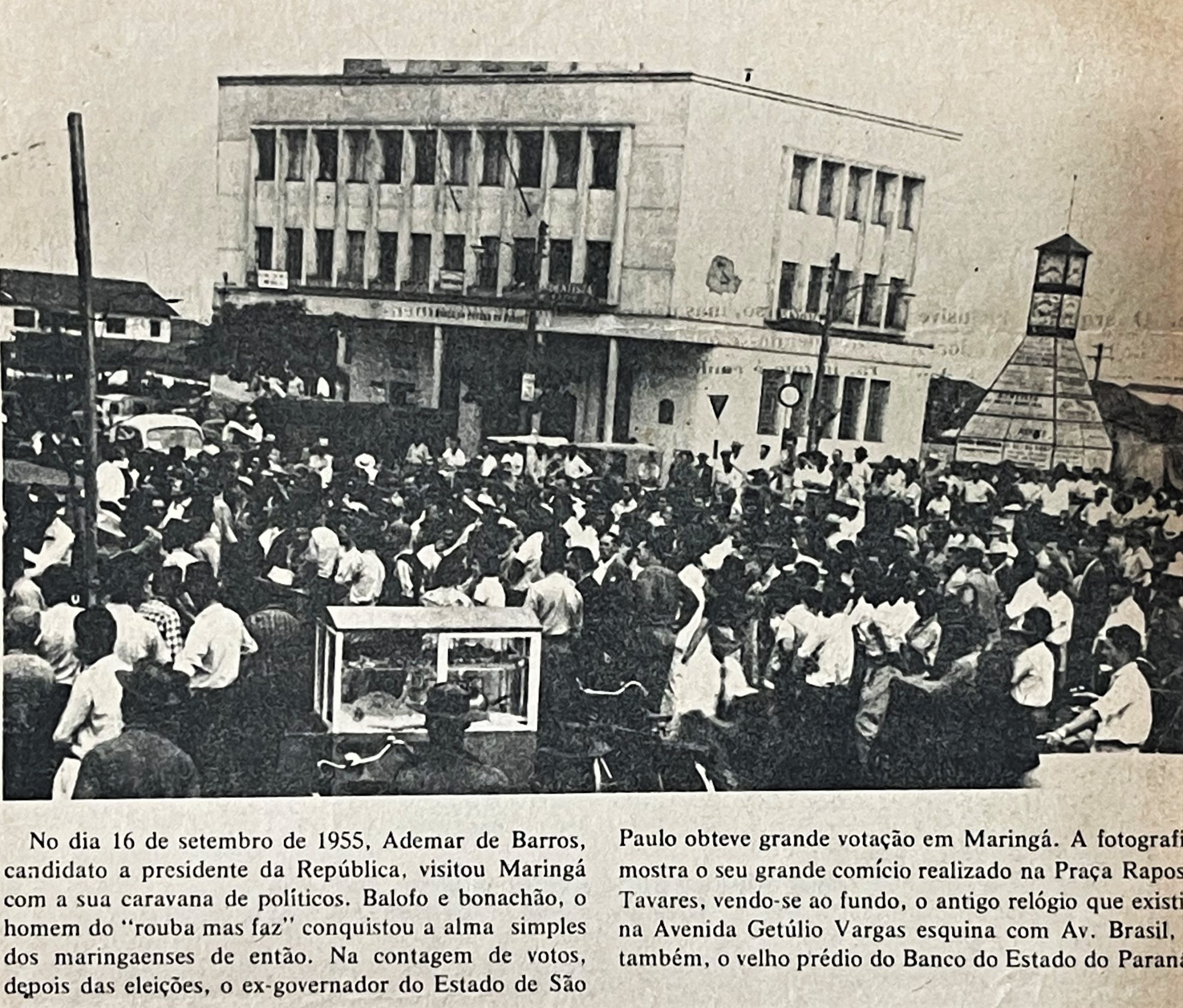À esquerda da imagem vemos a Praça Raposo Tavares. Na esquina da Praça vemos também o prédio que abrigava a loja Cunha Rego, onde hoje se encontra o Edifício Centro Comercial Maringá. À direita, vemos o Banco do Estado do Paraná, inaugurado em 1953.