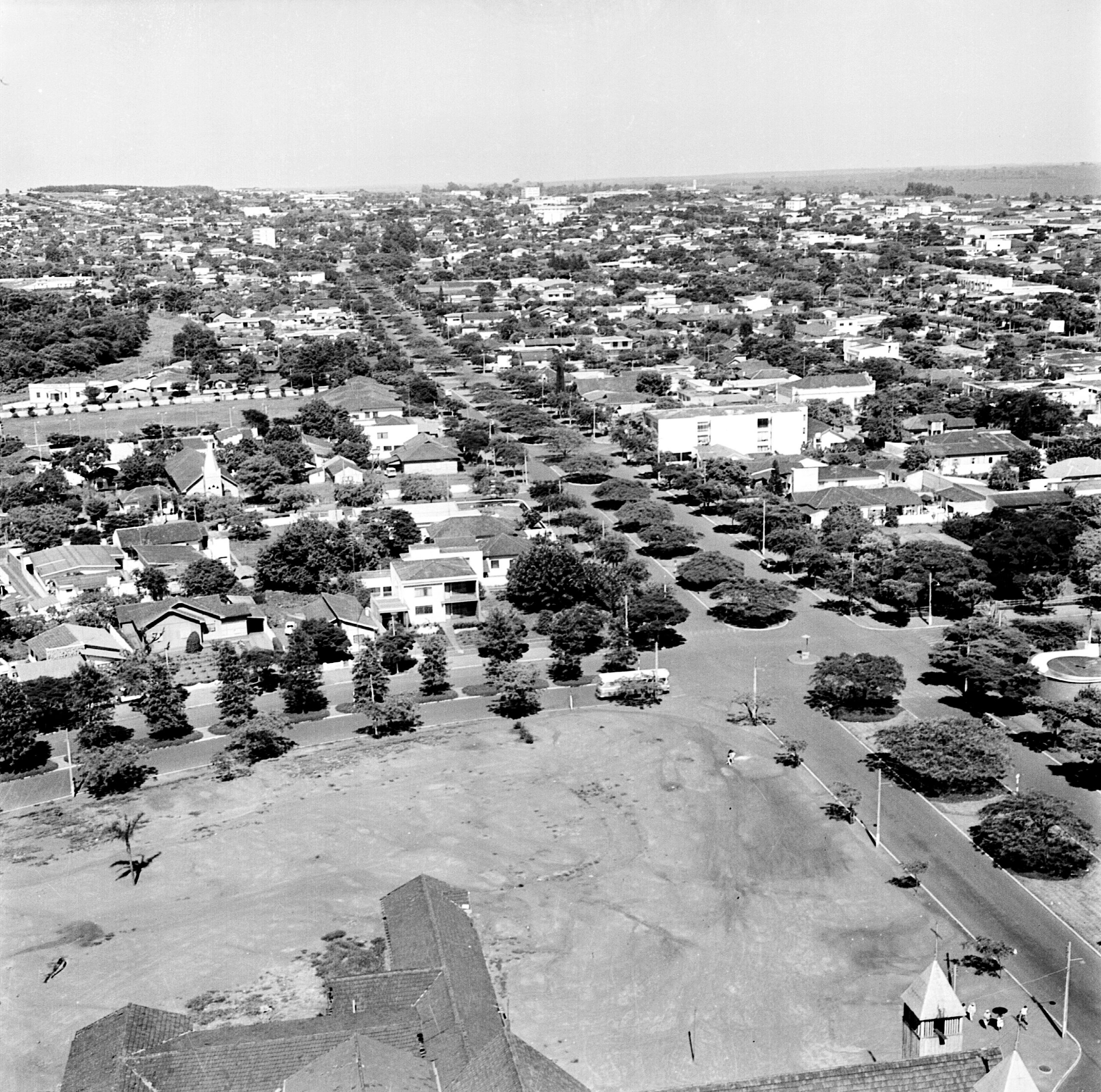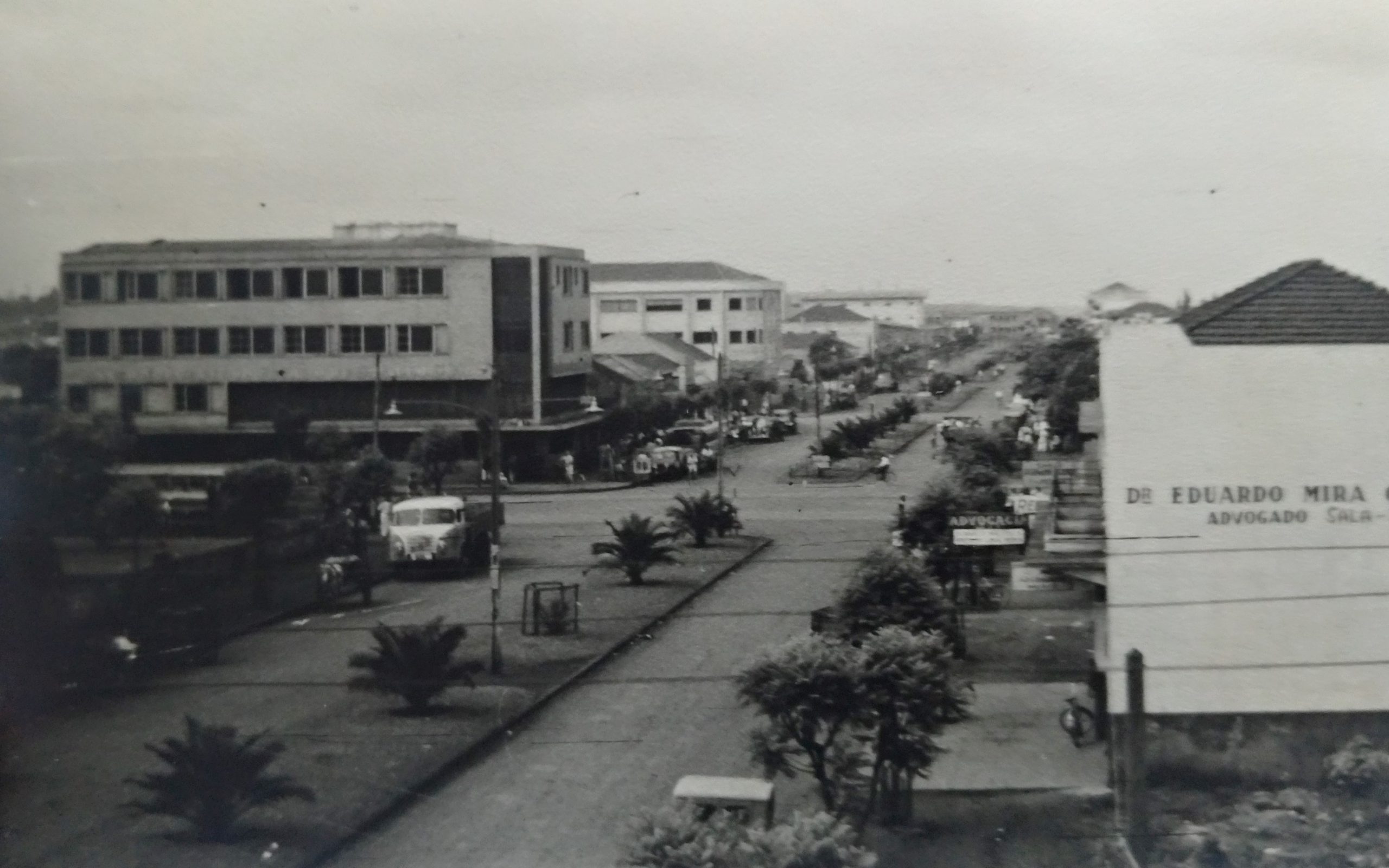 Registro aéreo que mostra boa parte da região central da cidade. Em destaque, no meio da imagem, vemos a Avenida Duque de Caxias, que terminava na Avenida Tamandaré. Vemos também a estação rodoviária à direita, bem como a colônia dos funcionários da estação ferroviária em frente à ela.