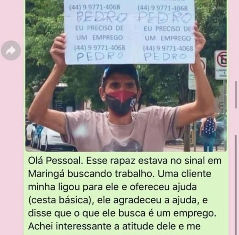 O primeiro contato da colega de Raiza foi para oferecer ajuda com uma cesta básica ao homem que pedia emprego no semáforo, em Maringá, mas ele não aceitou e enfatizou que o buscava mesmo era uma oportunidade de trabalho. Ela, então, compartilhou uma foto do homem segurando o cartaz em um grupo de profissionais de Recursos Humanos. E foi por meio desta mensagem que Raiza o conheceu.