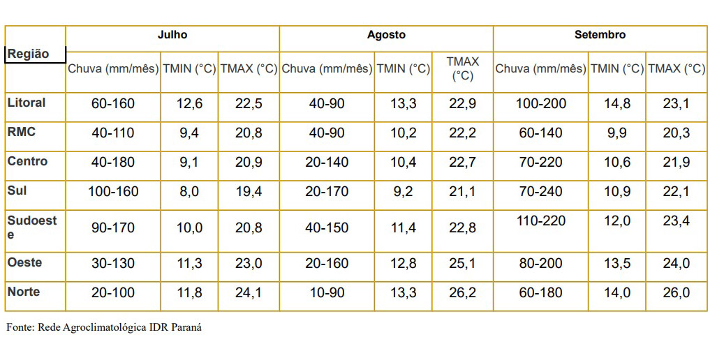 Confira os valores das médias históricas de chuva (faixa de variação), temperaturas mínimas e máximas para cada região do Paraná nos meses de julho, agosto e setembro: