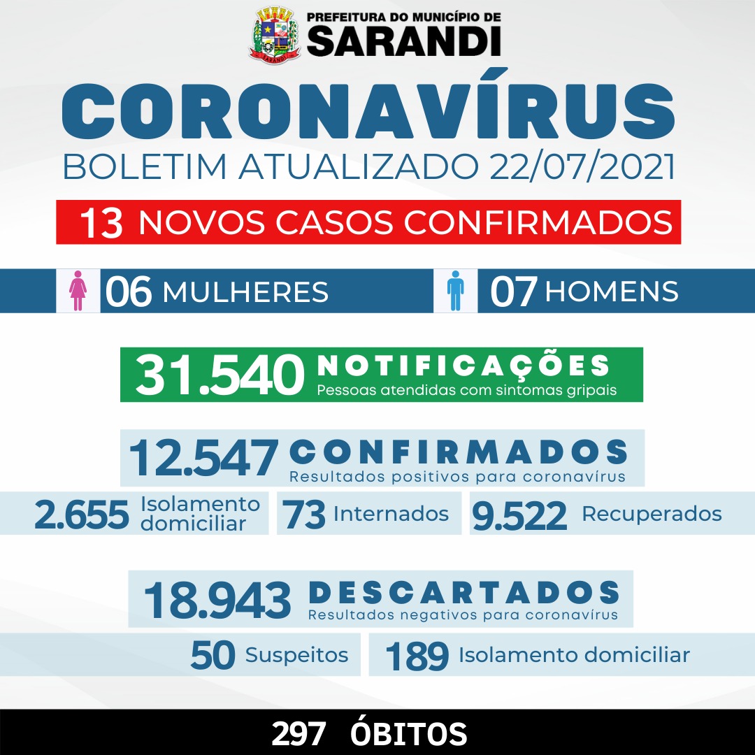 Atualmente, Sarandi possui 2.655 pacientes positivados com orientação de isolamento domiciliar e outros 73 internados. Desde o início da pandemia, a cidade teve 12.547 casos confirmados de Covid-19, com 9.522 recuperados e 297 óbitos. Confira o boletim completo:
