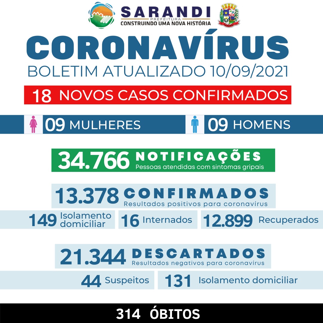 Atualmente, Sarandi possui 149 pacientes positivados com orientação de isolamento domiciliar e outros 16 internados. Desde o início da pandemia, a cidade teve 13.378 casos confirmados de Covid-19, com 12.899 recuperados e 314 óbitos. Confira o boletim completo: