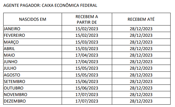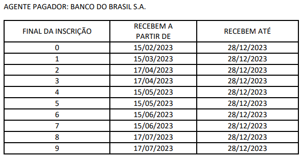 Veja abaixo o calendário completo de pagamento: