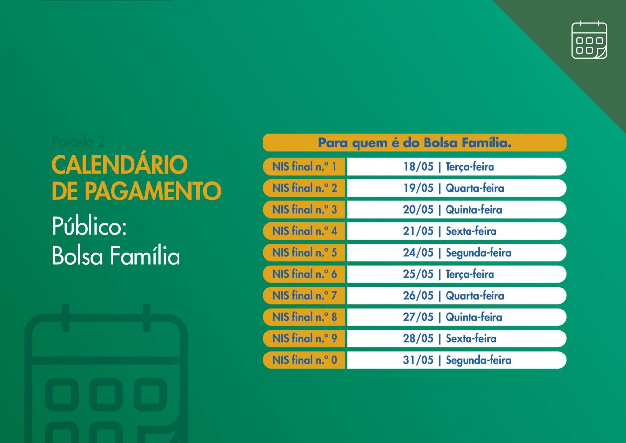 A segunda parcela será paga entre 16 de maio e 16 de junho, e a liberação para saques ocorrerá de 8 de junho e 8 de julho.