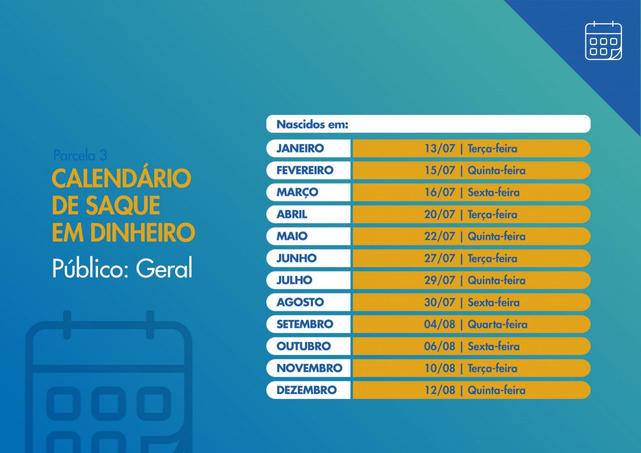 Na terceira parcela, o depósito será feito entre 20 de junho e 21 de julho, enquanto os saques ficarão disponíveis de 13 de julho a 12 de agosto.