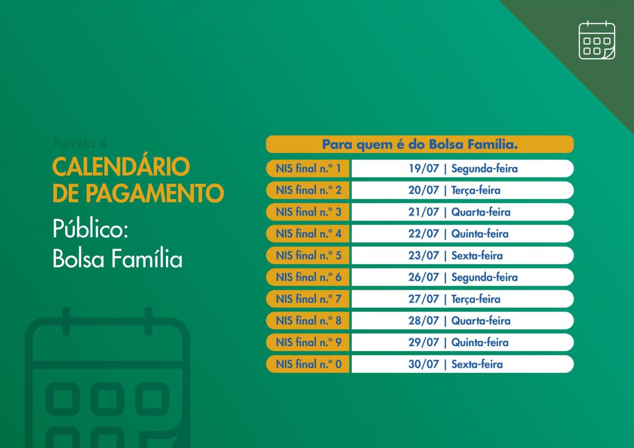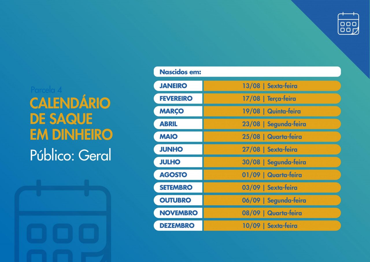 A quarta parcela será paga entre 23 de julho e 22 de agosto, e a liberação para saques será feita entre 13 de agosto e 10 de setembro. Confira o calendário detalhado abaixo da nova rodada do auxílio emergencial: