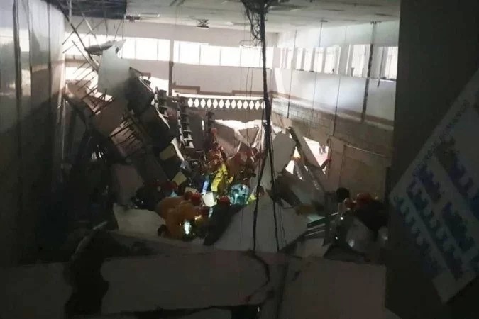 Imagens divulgadas pelo Corpo de Bombeiros mostram parte do interior do local do desabamento. No registro, bombeiros trabalham em meio aos escombros, incluindo o que parecem ser cadeiras de um auditório.