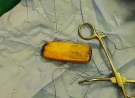 Quando foi realizado um raio-x, os médicos ficaram chocados ao descobriram o aparelho alojado no estômago. O procedimento de retirada foi feito imediatamente para evitar possíveis lesões fatais, no Hospital Universitário de Aswan.