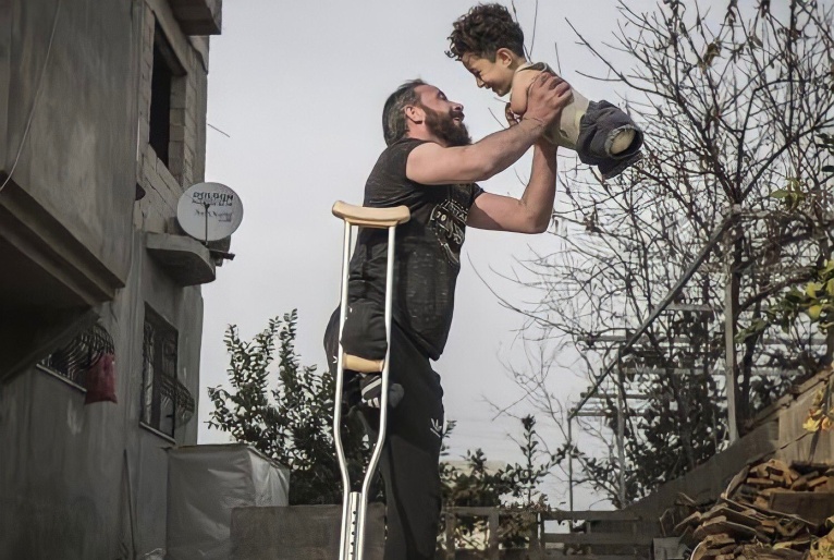 Apoiado em uma muleta com parte do que lhe restou da perna direita, um pai brinca com o filho, que não tem nenhum dos membros completos, jogando-o para cima, enquanto sorriem juntos. O instante foi capturado pelas lentes do fotógrafo turco Mehmet Aslan que levou o prêmio de “Foto do Ano” no Siena International Photo Awards.
