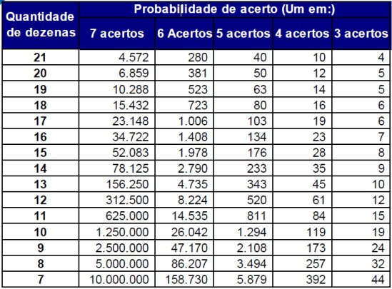 As probabilidades de acerto do Super Sete dependem da quantidade de dezenas marcadas na aposta, conforme quadro a seguir: