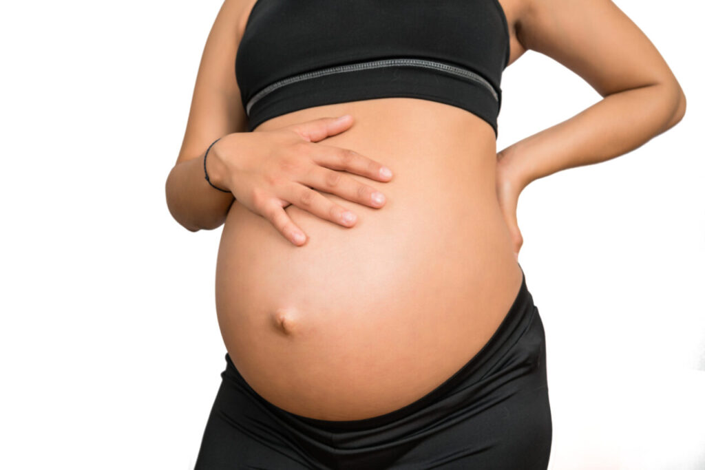 Close-up of pregnant woman touching her big belly. Pregnancy, motherhood and expectation concept.