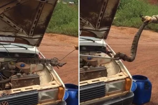 Segundo o Corpo de Bombeiros, o homem ligou para a corporação, que chegou ao local em aproximadamente cinco minutos. Para retirar o animal, a equipe contou com a ajuda de um “pinção”. Em seguida, o animal silvestre foi devolvido ao habitat natural. O réptil encontrado no carro é uma jiboia.