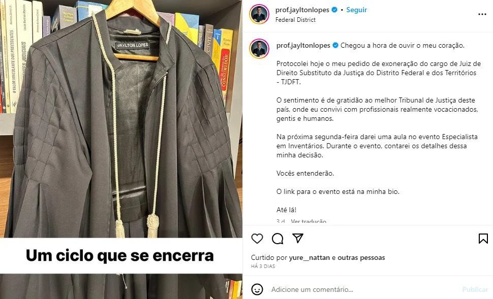 Após oito anos e nove meses como juiz do Tribunal de Justiça do Distrito Federal e dos Territórios (TJDFT), Jaylton Lopes Júnior pediu demissão do cargo na última sexta-feira, 4.